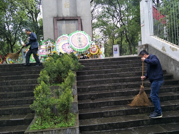 市委编办为弘扬中华民族传统美德和民族优秀文化,倡导感恩理念,增强干部职工“四个意识”。利用我们的节日“清明节”祭扫之际,通过到烈士墓碑前开展清扫墓地、文明祭祀倡导、为英烈鲜花、在烈士墓前宣誓等形式,增强广大党员爱党爱国意识,激发爱党爱国情怀。把对革命先烈的悼念,化为爱祖国、爱家乡的浓厚感情,化为爱岗敬业、奉献社会的实际行动,鼓励干部职工在工作岗位上不忘初心,敬业奉献。 清扫烈士园林  市委编办副主任徐志民开展文明祭祀倡导  市委编办主任伍恒光带领全体党员宣誓